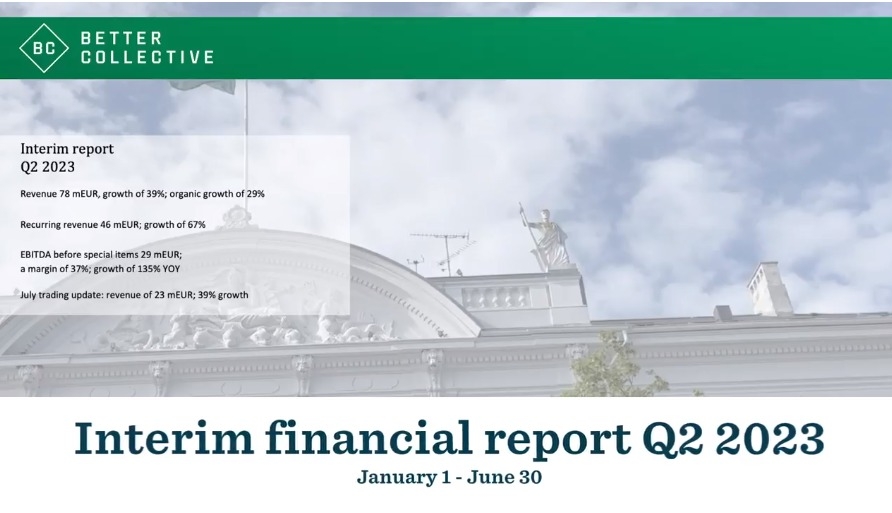 * Programa de recompra de ações de até 10 milhões de euros iniciado para ser executado durante o período de 7 de julho a 21 de agosto. O valor de mercado das ações próprias da Better Collective é de € 28 milhões. O objetivo da recompra é cobrir pagamentos futuros relativos a aquisições e programas LTI.