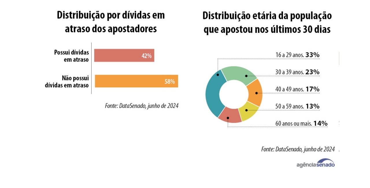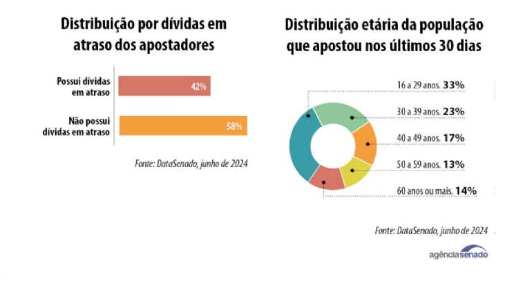 O Instituto DataSenado apurou ainda o percentual de apostadores com dívidas em atraso há mais de 90 dias. Eles representam 58% das pessoas que gastaram com bets por meio de aplicativos ou sites na internet.