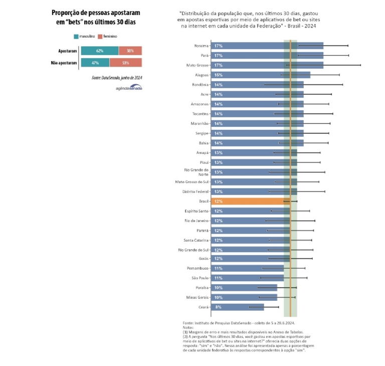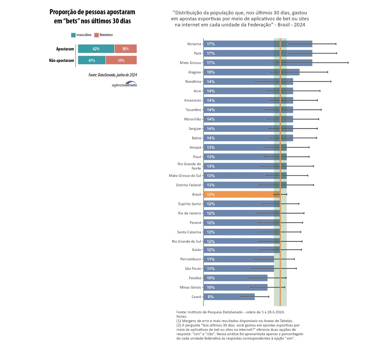 De acordo com a pesquisa, 12% dos brasileiros, em média, declararam ter feito algum tipo de aposta esportiva nos últimos 30 dias. A proporção é similar em quase todas as regiões do país, exceto em quatro estados: Roraima, Mato Grosso e Pará apresentaram percentual de 17%, acima da média nacional, enquanto Ceará ficou abaixo, com 8%.