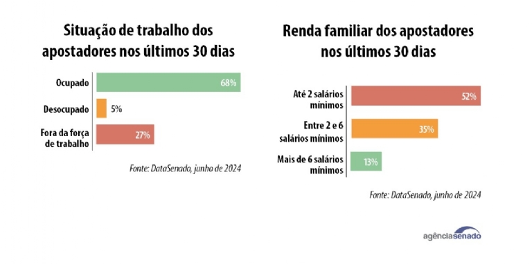 A maior parte dos apostadores recebe até dois salários-mínimos (52%) por mês. A fatia que ganha entre dois e seis mínimos é de 35%, enquanto 13% afirmam receber uma remuneração superior.