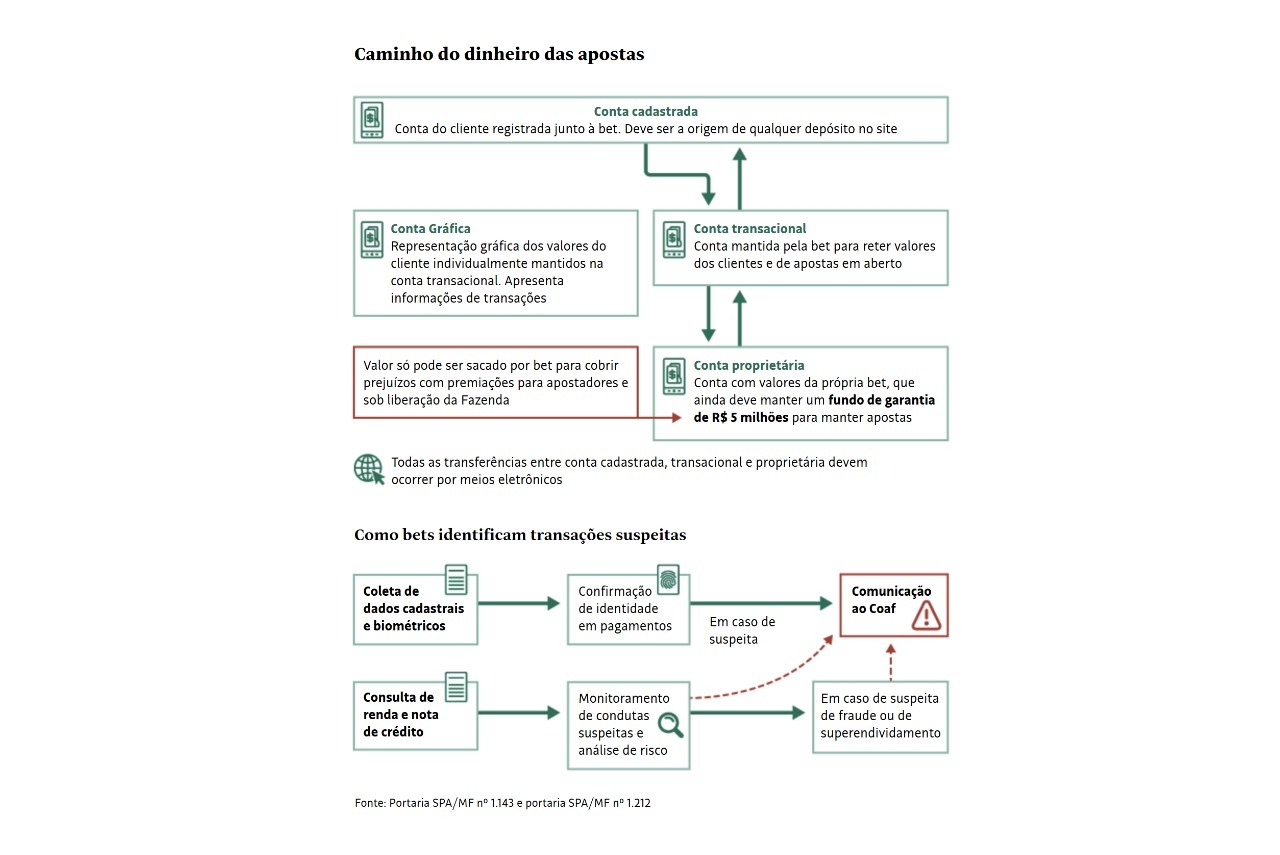 Além de verificar a identidade, as plataformas de pagamento terão de consultar informações de renda do cliente junto aos bancos e a sua nota de crédito nos birôs, como o Serasa. A partir desses dados, cada transação deve passar por uma análise de risco de infrações –além de lavagem de dinheiro, financiamento de terrorismo e manipulação esportiva.