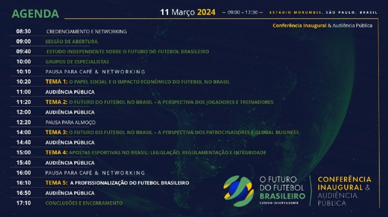 Às 15h, especialistas como Tiago Horta, Head of integrity, Genius Sports, debaterão sobre “Apostas esportivas no Brasil: Legislação, Regulamentação e Integridade” para dar iniciar depois (15:40h) uma audiência pública sobre o tema.