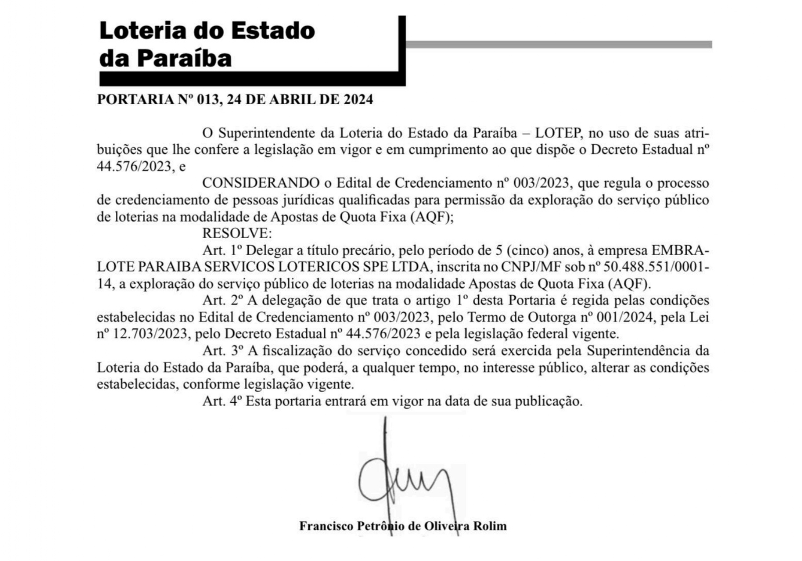 A autorização foi publicada hoje (25/04) no diário oficial do Estado autorizando a SPE da Embralote na Paraíba a operar. A empresa, que passou pelo processo de credenciamento e pagou uma outorga de 2 milhões de reais, colocou imediatamente o site no ar em operação (www.pb.embralote.com.br).