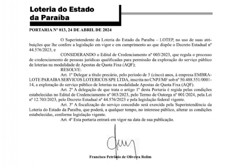O Superintendente da LOTEP, Francisco Petrônio, também comentou: “Esta é mais uma evolução da Loteria da Paraíba. As bets que estiverem reguladas pela Lotep terão todo nosso apoio e suporte necessário para condução e exploração deste serviço público do Estado, que passa a ter a mais uma nova fonte de receita para o povo paraibano”.