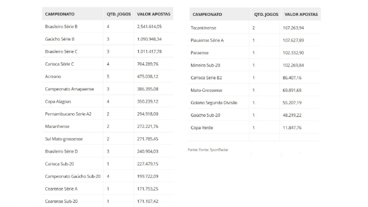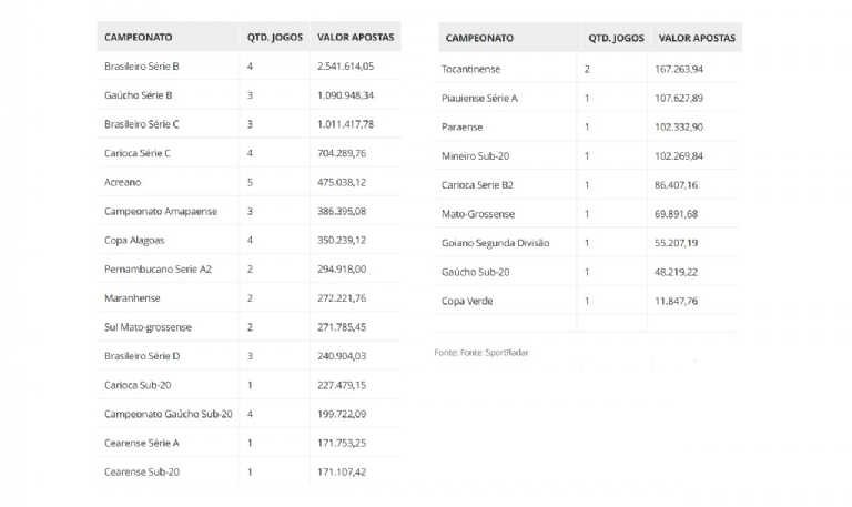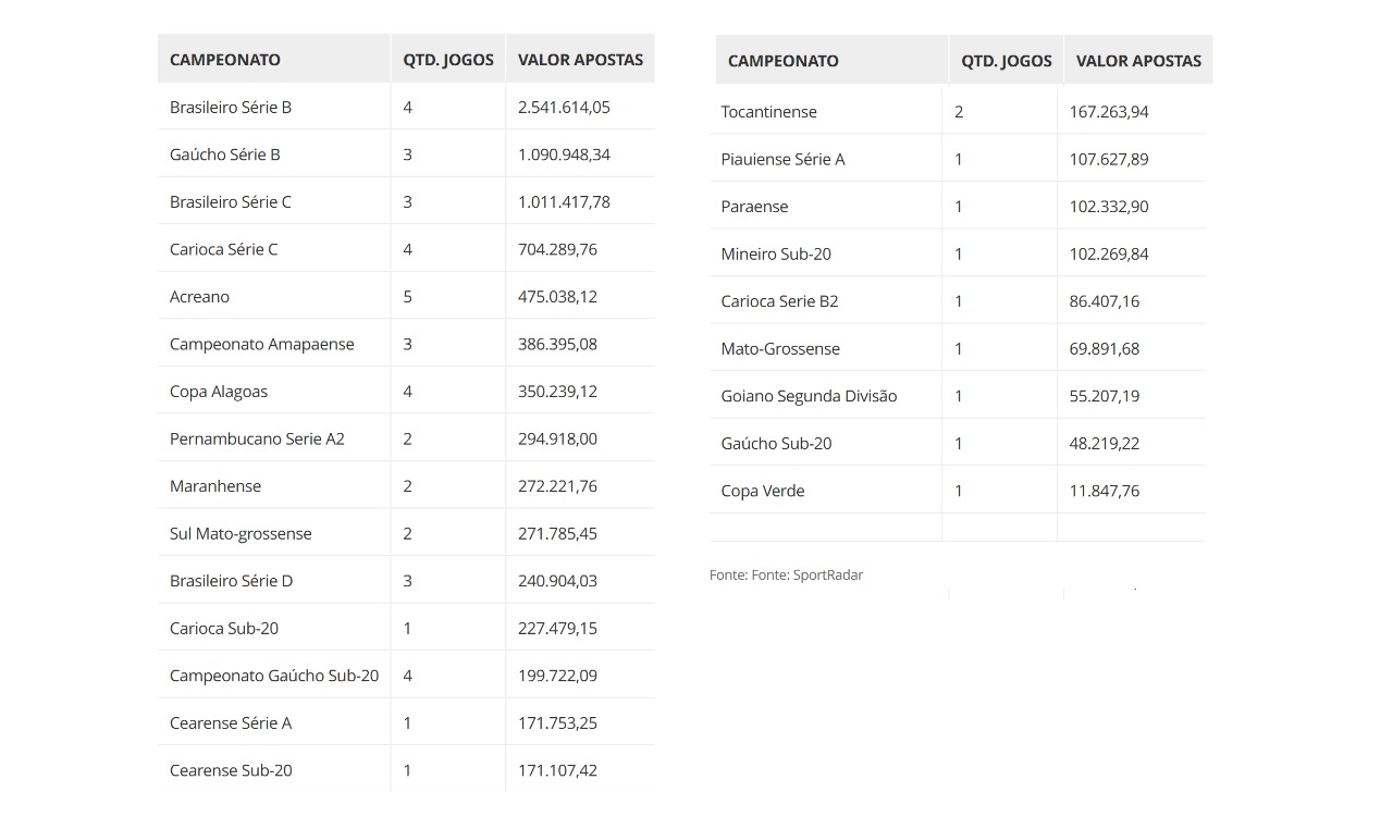 As partidas destacadas pela Sportradar são dos campeonatos brasileiros das séries B, C e D, Copa Verde e campeonatos estaduais profissionais e sub-20.