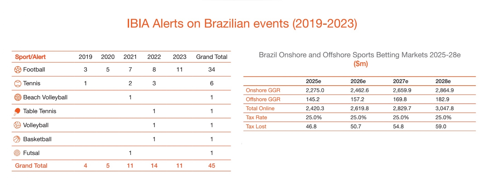 Os membros da IBIA que operam no Brasil representam mais de 60% do mercado de jogos de azar. Nos últimos cinco anos, a IBIA relatou 45 casos de atividades suspeitas de apostas em eventos esportivos brasileiros.