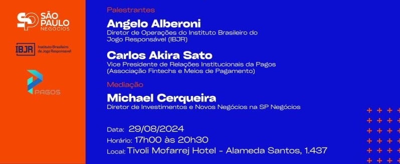 Angelo Alberoni (diretor de operações do IBJR), Michael Sotelo Cerqueira (diretor de promoção de investimentos e novos negócios da SP Negócios), e Carlos Akira Sato (VP de relações institucionais da PAGOS), discutirão os caminhos para o segmento de apostas de quota fixa após a regulamentação da atividade pelo governo federal.