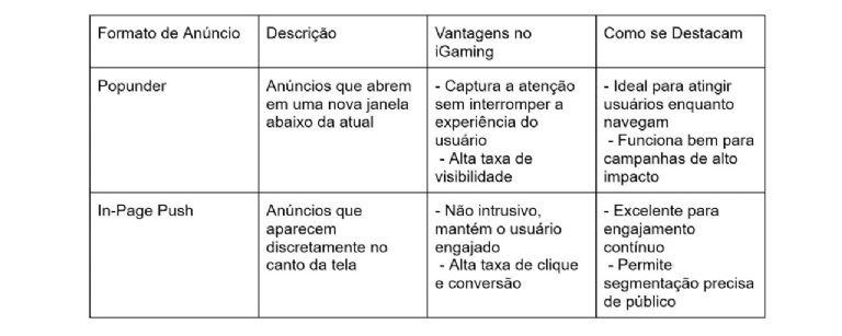 Os formatos de anúncio como popunder e in-page push são amplamente utilizados no iGaming devido à sua eficácia em capturar a atenção do usuário. Vamos comparar esses dois formatos:
