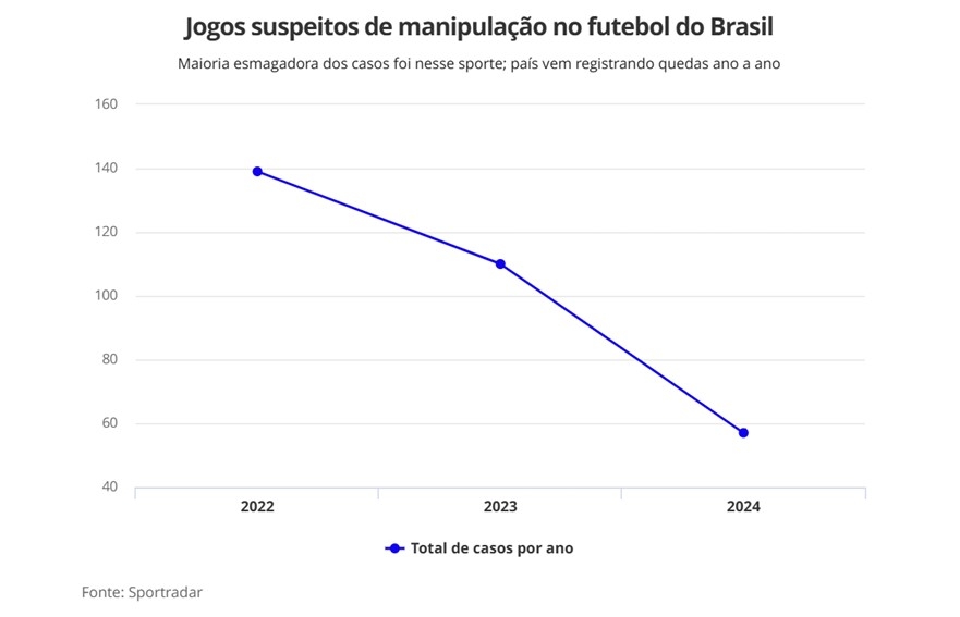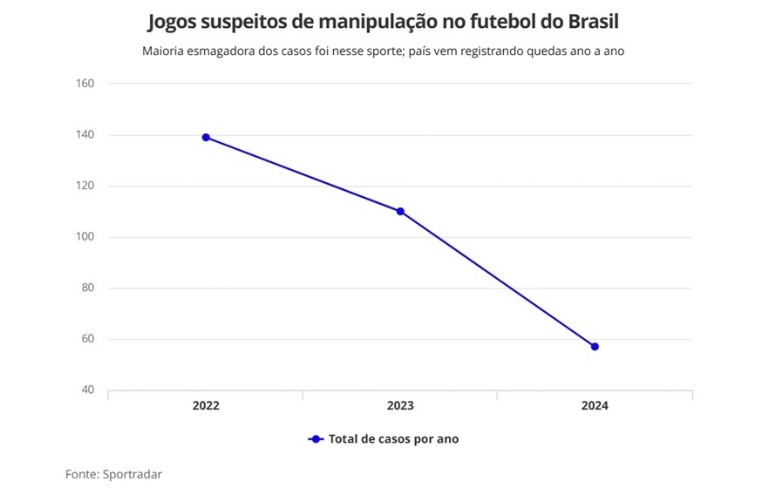 Essa queda em 2024 também foi identificada pela CBF, que recebeu menos relatórios de jogos suspeitos. A confederação, federações estaduais, clubes e empresas de apostas têm adotado nos últimos meses diferentes práticas de prevenção e combate à manipulação.