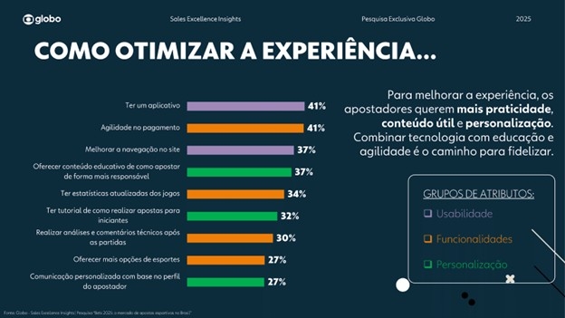 Em pesquisa recente realizada pela Globo, sete das nove exigências dos apostadores para otimização da experiência nos sites de apostas são recursos de personalização e funcionalidade.
