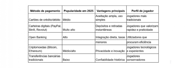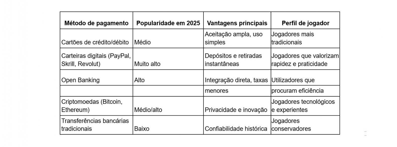 O open banking ganhou espaço, ligando diretamente bancos e plataformas de iGaming, com taxas reduzidas e maior transparência. Já as criptomoedas, como Bitcoin ou Ethereum, deixaram de ser novidade e consolidaram-se como alternativa para quem valoriza privacidade e inovação.