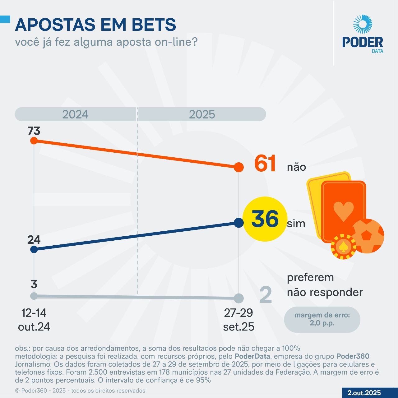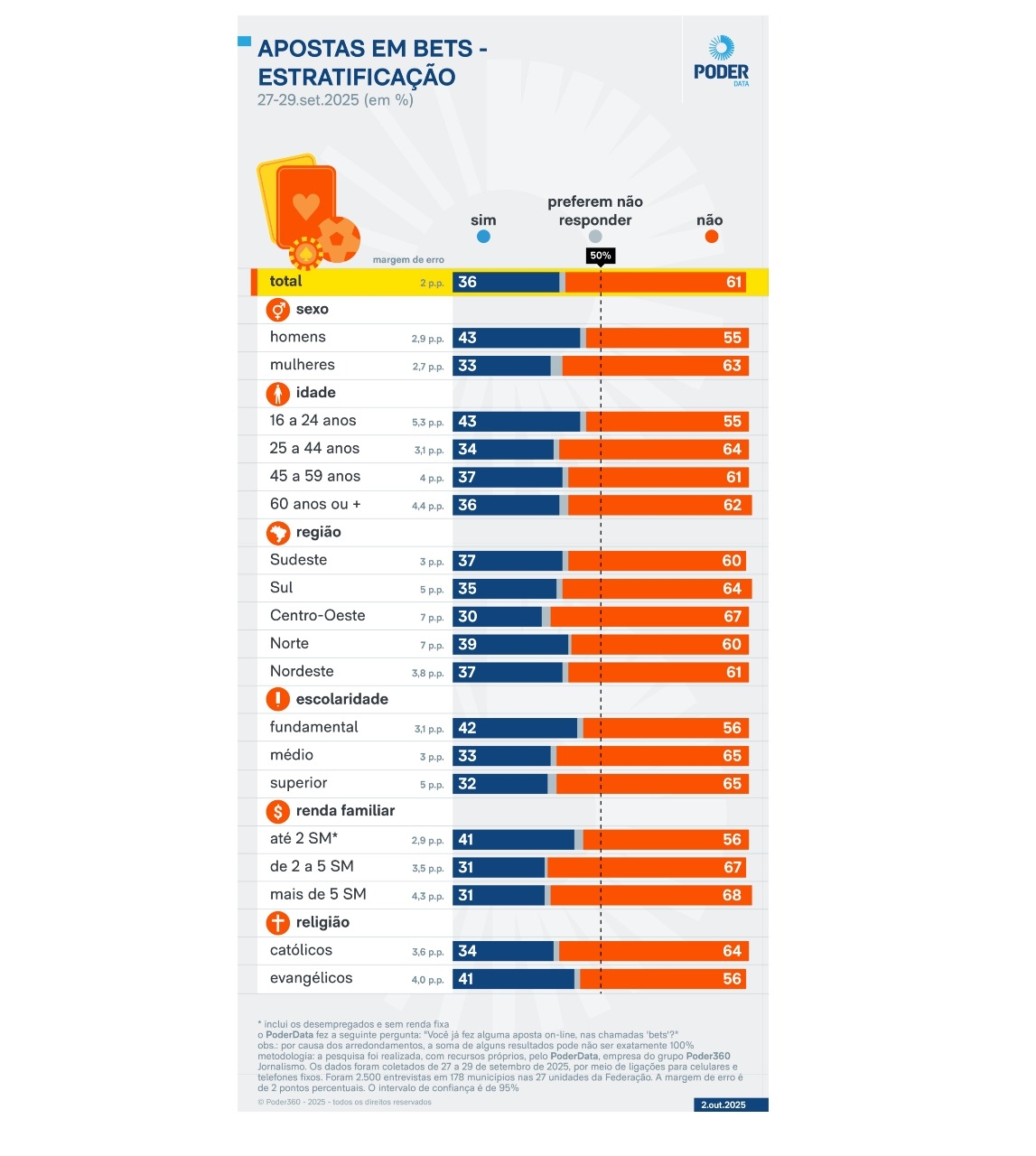 A pesquisa foi realizada pelo PoderData, empresa do grupo Poder360 Jornalismo, com recursos próprios. Os dados foram coletados de 27 a 29 de setembro de 2025, por meio de ligações para celulares e telefones fixos. Foram 2.500 entrevistas em 178 municípios nas 27 unidades da Federação. A margem de erro é de 2 pontos percentuais. O intervalo de confiança é de 95%.