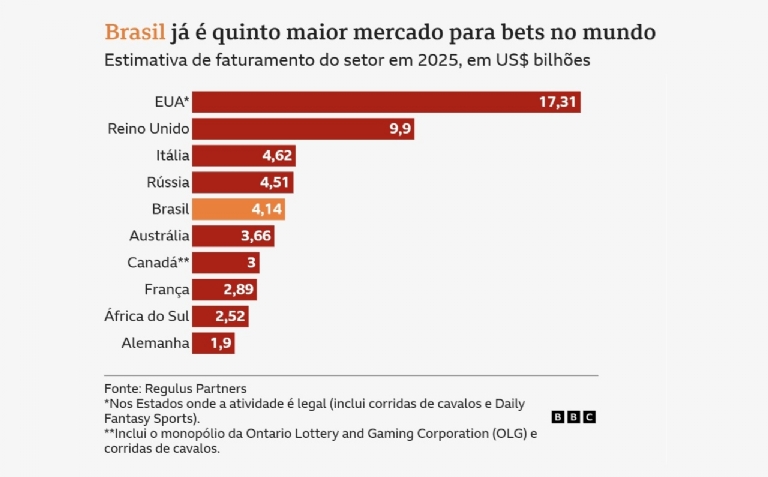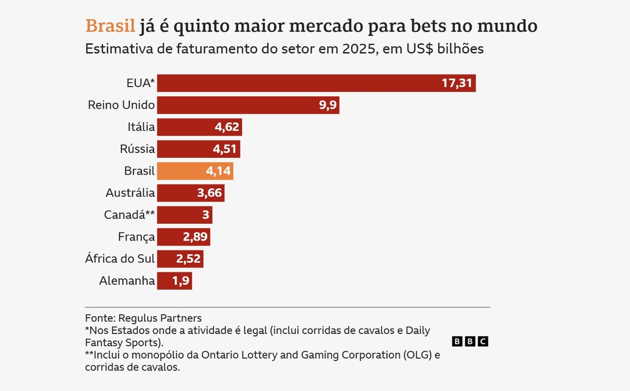 Um levantamento recente divulgado com exclusividade pela BBC News Brasil mostrou que as bets brasileiras devem faturar US$ 4,14 bilhões (cerca de R$ 22 bilhões) em 2025 — atrás apenas de Estados Unidos, Reino Unido, Itália e Rússia.