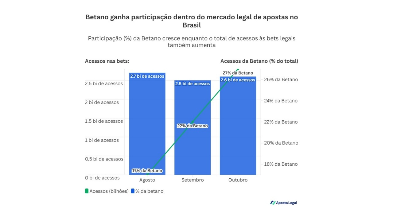 O salto culminou em um marco inédito: em outubro, a Betano se tornou a primeira casa de apostas da história a ultrapassar 600 milhões de acessos em um único mês, fechando com 719,9 milhões, o maior volume já registrado na história das casas de apostas no Brasil, segundo monitoramento exclusivo do Aposta Legal.