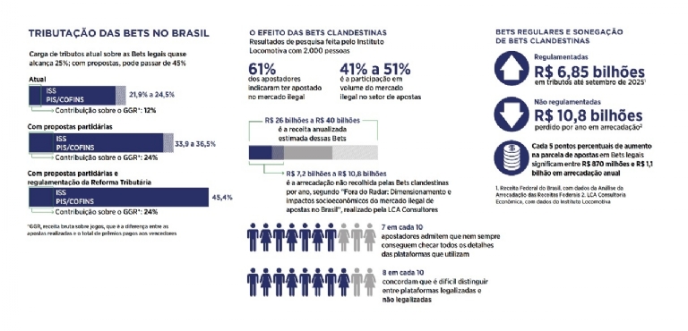 De janeiro a setembro, as plataformas licenciadas geraram R$ 6,85 bilhões, que financiam áreas como esporte, turismo, segurança e educação. Cada 5 pontos percentuais que migram da ilegalidade para o mercado regulado representam entre R$ 870 milhões e R$ 1,1 bilhão adicionais em tributos.