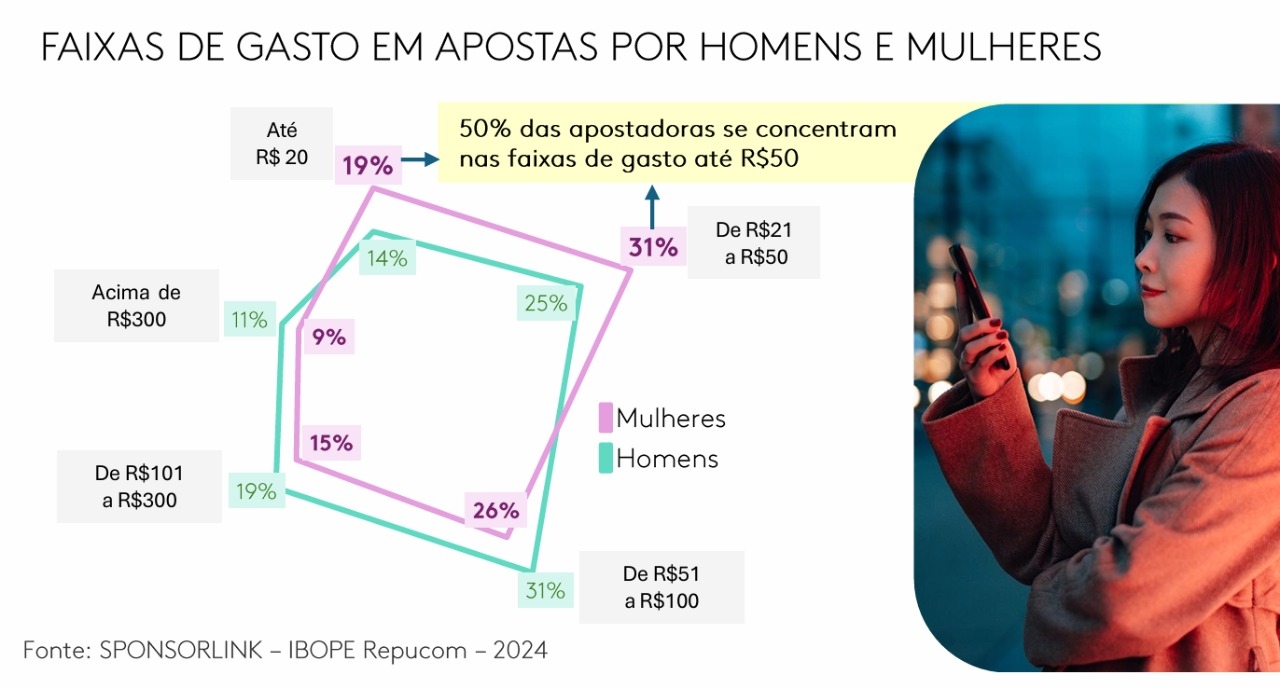 Outro dado que reforça esse perfil mais prudente das mulheres na relação com o setor é o valor investido nas apostas. Elas concentram 50% de suas apostas nas faixas de menor gasto, com valores de até R$ 50, demonstrando um comportamento mais moderado em comparação aos homens que concentram o valor de suas apostas nas faixas de gasto intermediária e alta.