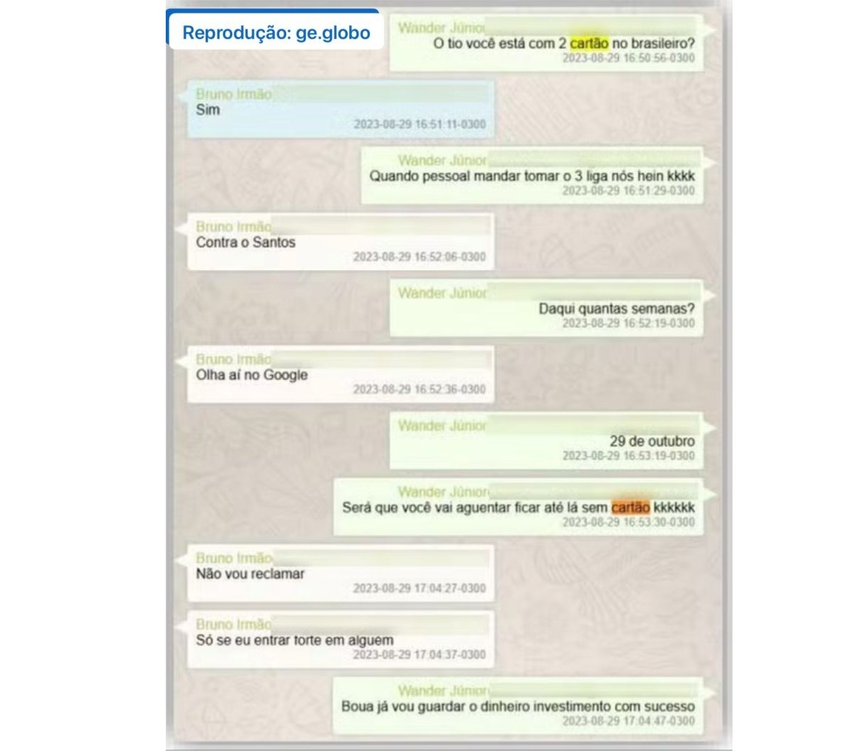 Para a PF, a troca de mensagens indica que Bruno Henrique teria passado ao irmão informações antecipadas sobre o recebimento de cartão amarelo no confronto contra o Santos. Para os investigadores, um trecho chamou a atenção: o momento em que Wander questiona o irmão se “aguentaria ficar até a data sem receber um cartão amarelo”.