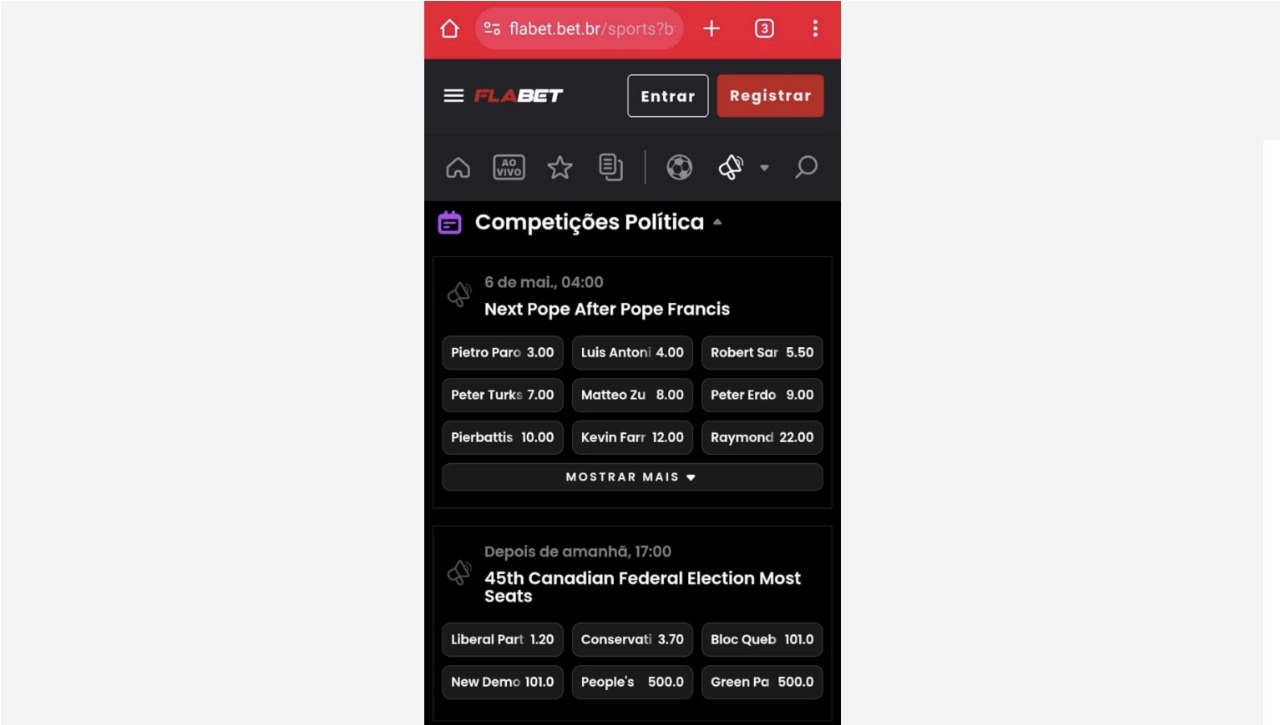 O site da FlaBet disponibilizou apostas no sucessor de Jorge Mario Bergoglio, o papa Francisco, dentro de uma seção que batizou de “competições políticas”. A página recebeu ainda apostas sobre eleições canadenses, o que também afronta a principal lei das bets.