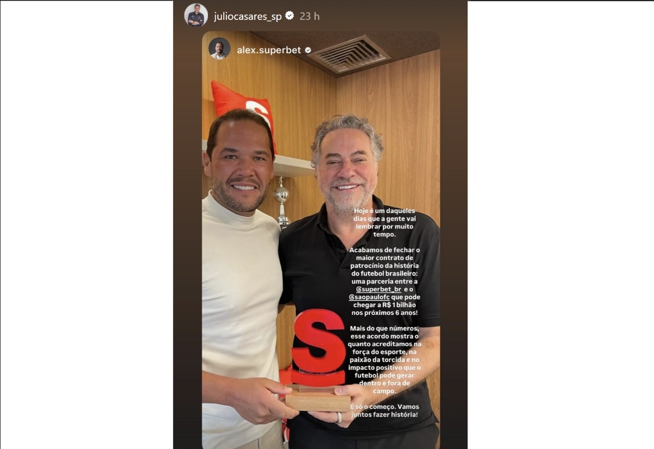 “Hoje é um daqueles dias que a gente vai lembrar por muito tempo. Acabamos de fechar o maior contrato de patrocínio da história do futebol brasileiro: uma parceria entre a Superbet e o São Paulo que pode chegar a R$ 1 bilhão nos próximos seis anos!”, afirmou Alexandre Fonseca, CEO da Superbet no Instagram.