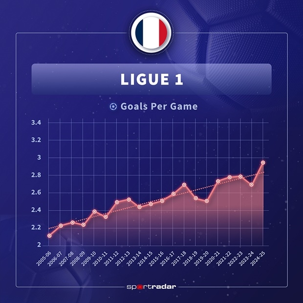 - A Ligue 1 está se consolidando como uma das competições mais emocionantes da Europa para os torcedores, evidenciada pela média de gols marcados por jogo de duas décadas atrás (2,13) em comparação com 2024/25 (2,96).