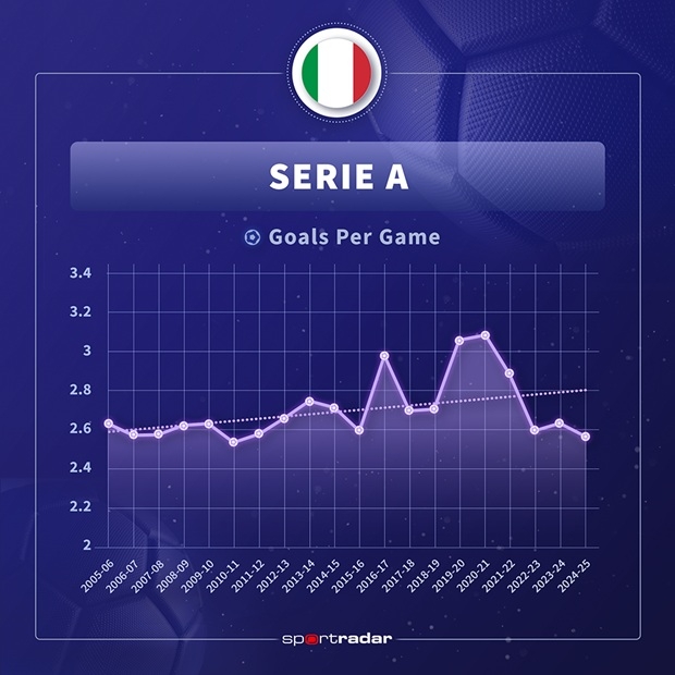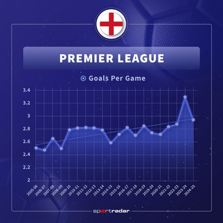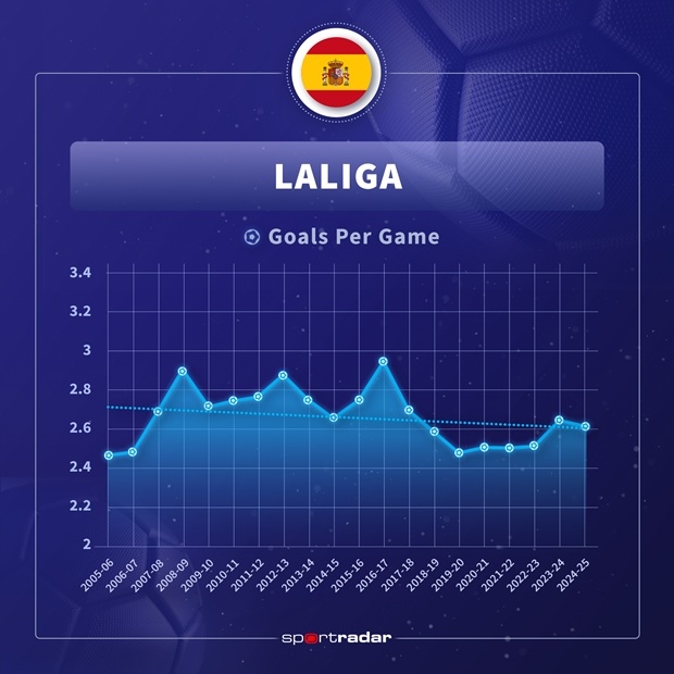 - Há menos gols sendo marcados na La Liga. Em 2005/06, a média era de 2,46 gols por jogo, equivalente à da Premier League na época. Mas a proporção cresceu rapidamente nos 10 anos seguintes, atingindo o pico em 2016/17, com 2,94 gols por jogo, coincidindo com o auge da carreira de jogadores como Lionel Messi, Luiz Suárez e Cristiano Ronaldo. Desde então, a média caiu para 2,62 gols por jogo na temporada 2024/25.