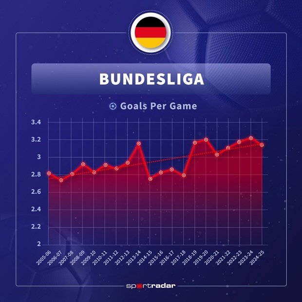 Mais de 18.000 gols foram marcados na Bundesliga desde o início da temporada 2005/06, apesar de a liga de 18 times ter disputado entre 1.000 e 1.500 partidas a menos do que as outras cinco grandes ligas da Europa nesse período.