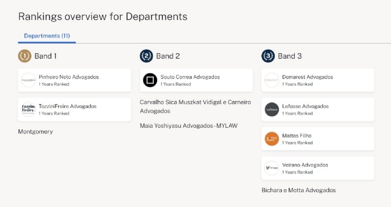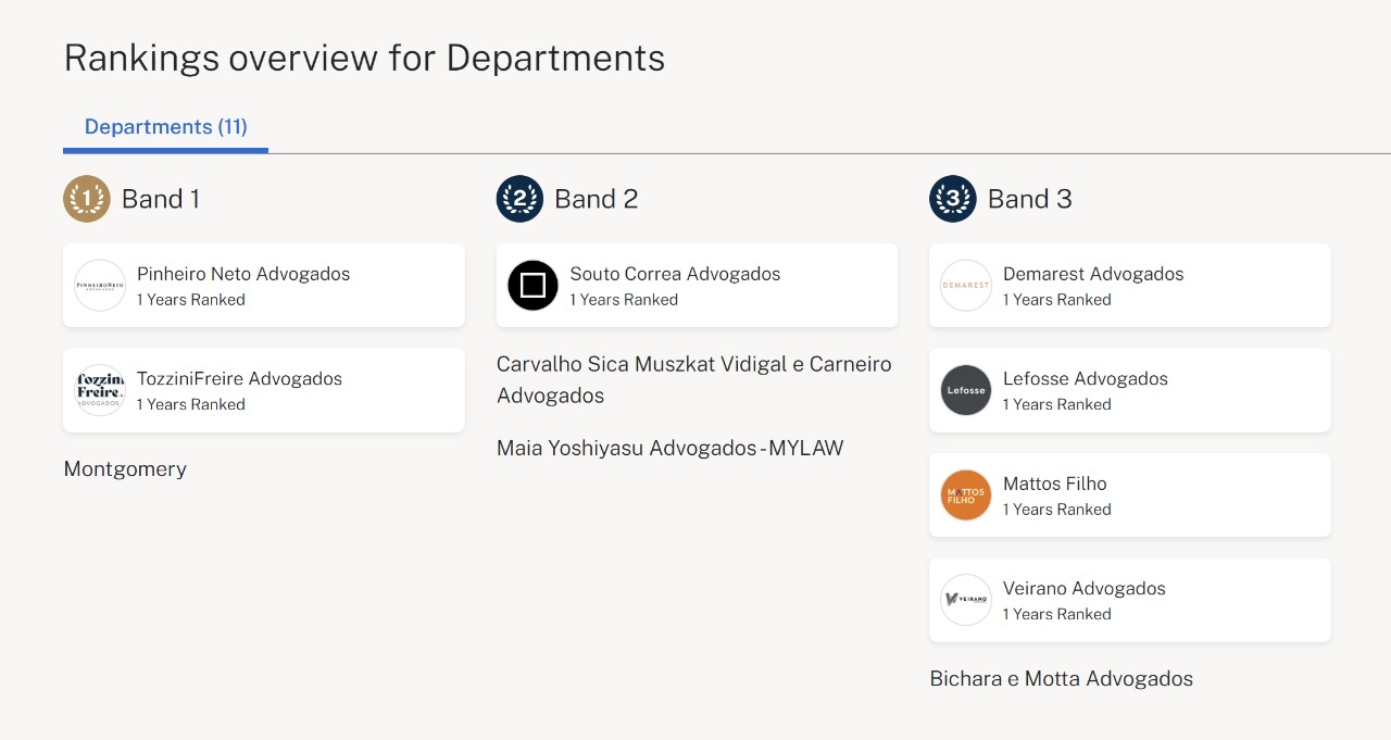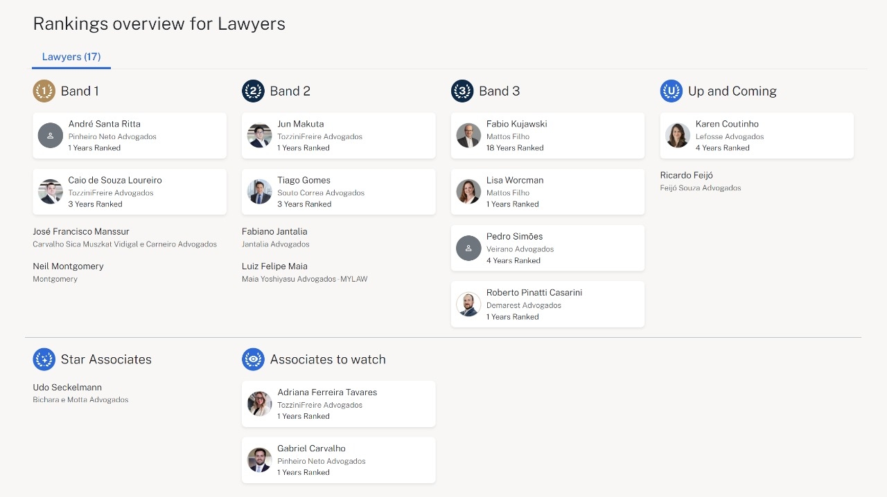 No total, 11 escritórios e 17 advogados foram ranqueados em três níveis de excelência, com o “Band 1” representando o mais alto grau de reconhecimento. Entre os escritórios mais bem avaliados, destacam-se Montgomery, Pinheiro Neto e Tozzini Freire.