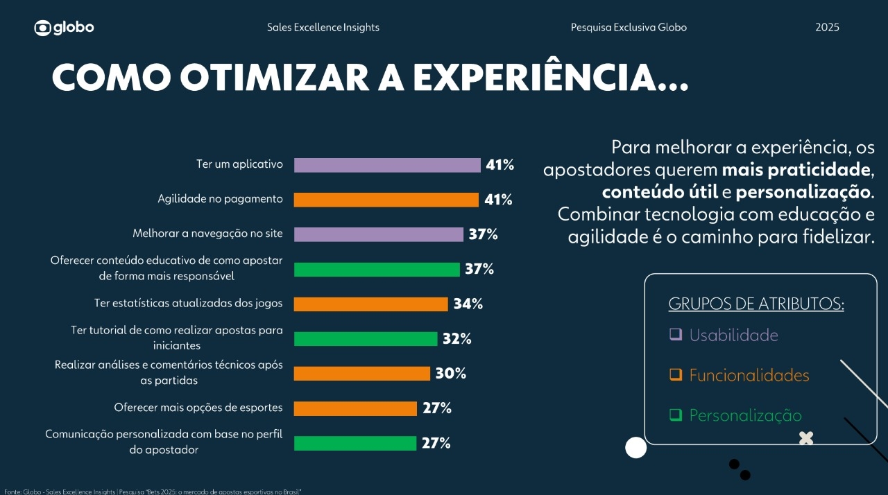 O objetivo do Grupo Globo foi entender o atual cenário do mercado de apostas esportivas no Brasil após a regulamentação, identificando oportunidades e desafios para as marcas frente ao público com perfil apostador e também não apostador, além de mapear suas relações com os diferentes meios de comunicação.