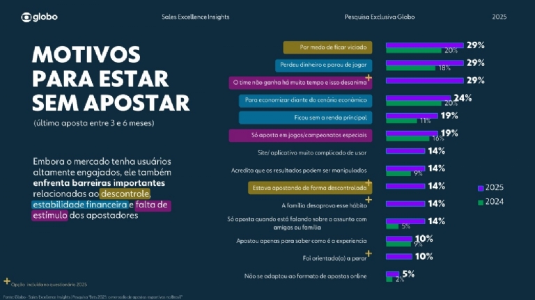 Em parceria com a Offerwise, o estudo quantitativo online “Sales Excellence Insights | Pesquisa “Bets 2025: o mercado de apostas esportivas no Brasil” foi realizada em maio passado, com target de homens e mulheres brasileiros maiores de 18 anos. A mostra contou com 1.000 entrevistas (59% de apostadores e 41% de não apostadores) e se divide em 5 conteúdos: