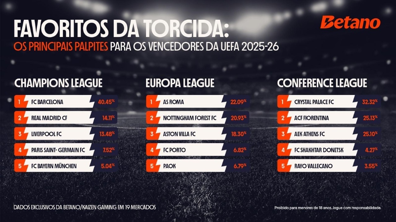 Dados da Kaizen Gaming na plataforma de apostas e jogos online Betano de 19 países apontam o Barcelona como favorito para vencer a Liga das Campeões da temporada de 2025-26. A fase de grupos começa no dia 16 de setembro. O favoritismo do clube espanhol é de 40% do total de apostas.