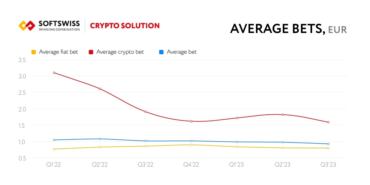 A análise da aposta média apresenta uma imagem cativante. Embora a aposta fiduciária média permaneça estável, oscilando em torno de 0,82 euros durante os três primeiros trimestres de 2023, bem como no mesmo período de 2022, a aposta crypto média perdeu quase 30 p.p. em média, apresentando uma variabilidade trimestre a trimestre. Aumentou inicialmente de 1,56 euros no final de 2022 para 1,88 euros no segundo trimestre de 2023, mas posteriormente diminuiu para 1,59 euros no terceiro trimestre de 2023. Tais flutuações podem ser atribuídas à volatilidade inerente às taxas de criptomoeda e às expectativas do mercado.