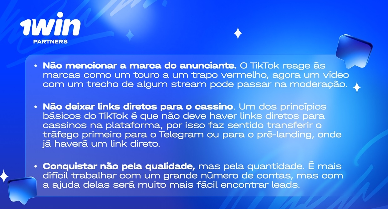 * Não deixar links diretos para o cassino. Um dos princípios básicos do TikTok é que não deve haver links diretos para cassinos na plataforma, por isso faz sentido transferir o tráfego primeiro para o Telegram ou para o pré-landing, onde já haverá um link direto.