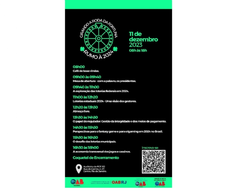 Com grade ainda sendo elaborada, as Comissões de Direito dos Jogos Esportivos, Lotéricos e Entretenimento da OAB-RJ, OAB-DF, OAB-MA e OAB Nacional agendaram para 11 de dezembro a realização de um seminário que irá discutir os rumos das loterias, cassinos, fantasy games e apostas esportivas para 2024.
