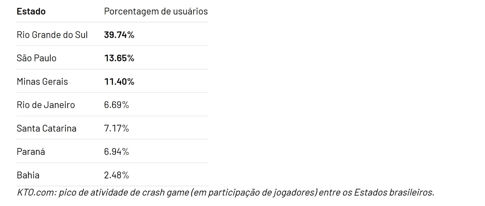 A tabela abaixo mostra as médias combinadas em compartilhamentos de usuários para Aviator, Spaceman, JetX e Mines e os Estados mais ativos nos jogos da KTO.