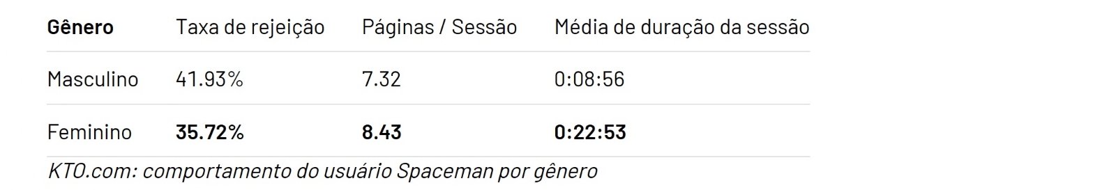 Fãs do sexo feminino do Spaceman, em particular, registram uma taxa de rejeição muito menor depois que chegam à página. Eles também gastam quase três vezes mais tempo que os homens em páginas KTO relacionadas, visitando mais recursos nesse meio tempo.