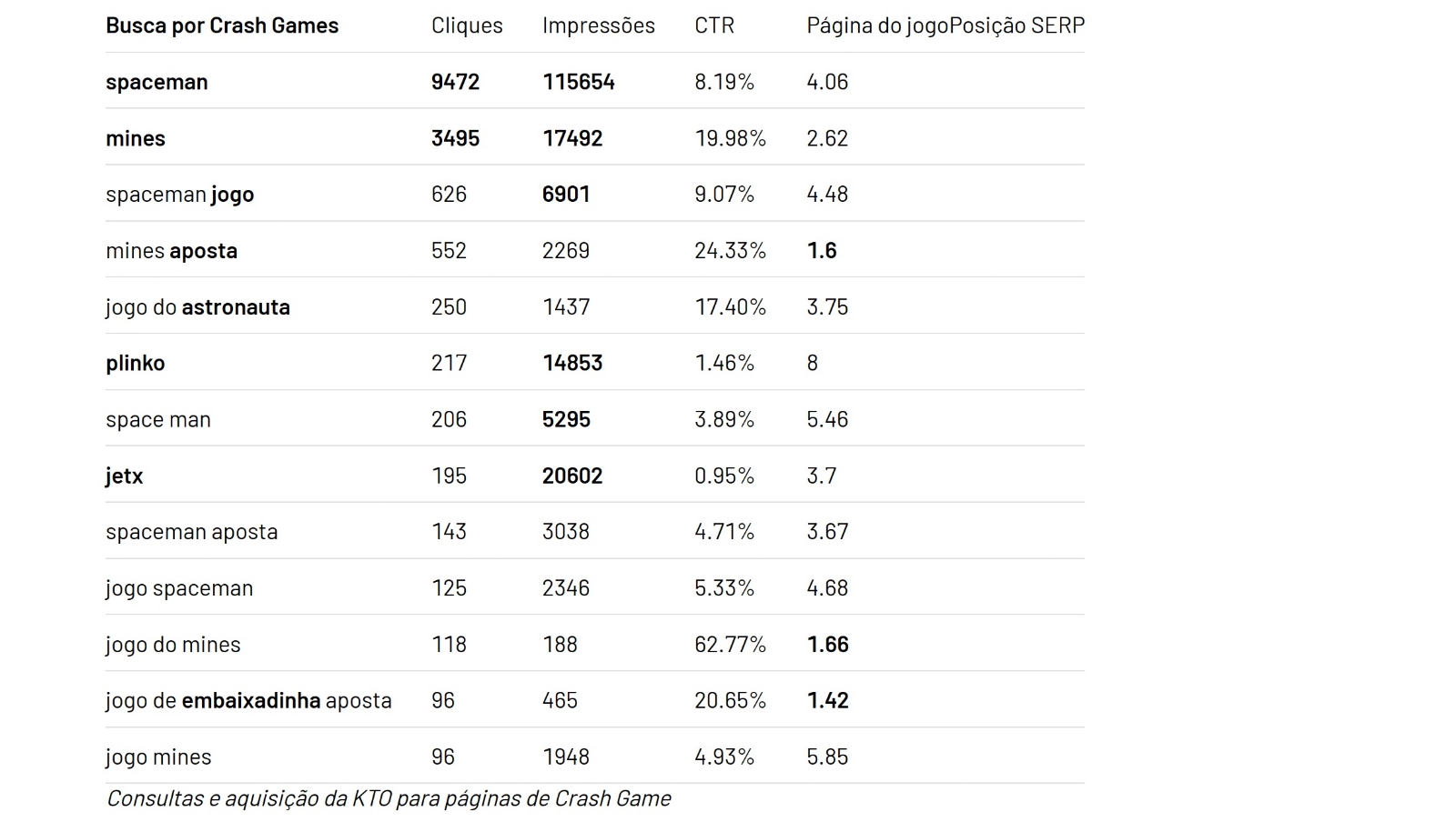 Podemos ver claramente que Spaceman, Mines, Plinko e JetX mostram uma quantidade substancial de impressões mesmo quando o CTR é baixo, provavelmente devido ao baixo posicionamento da página logo após o lançamento do jogo. Muitos acabam sendo procurados em um termo coloquial que fica marcado na memória dos jogadores – por exemplo, “embaixadinha” é uma referência descritiva ao jogo FootballX (veja abaixo).