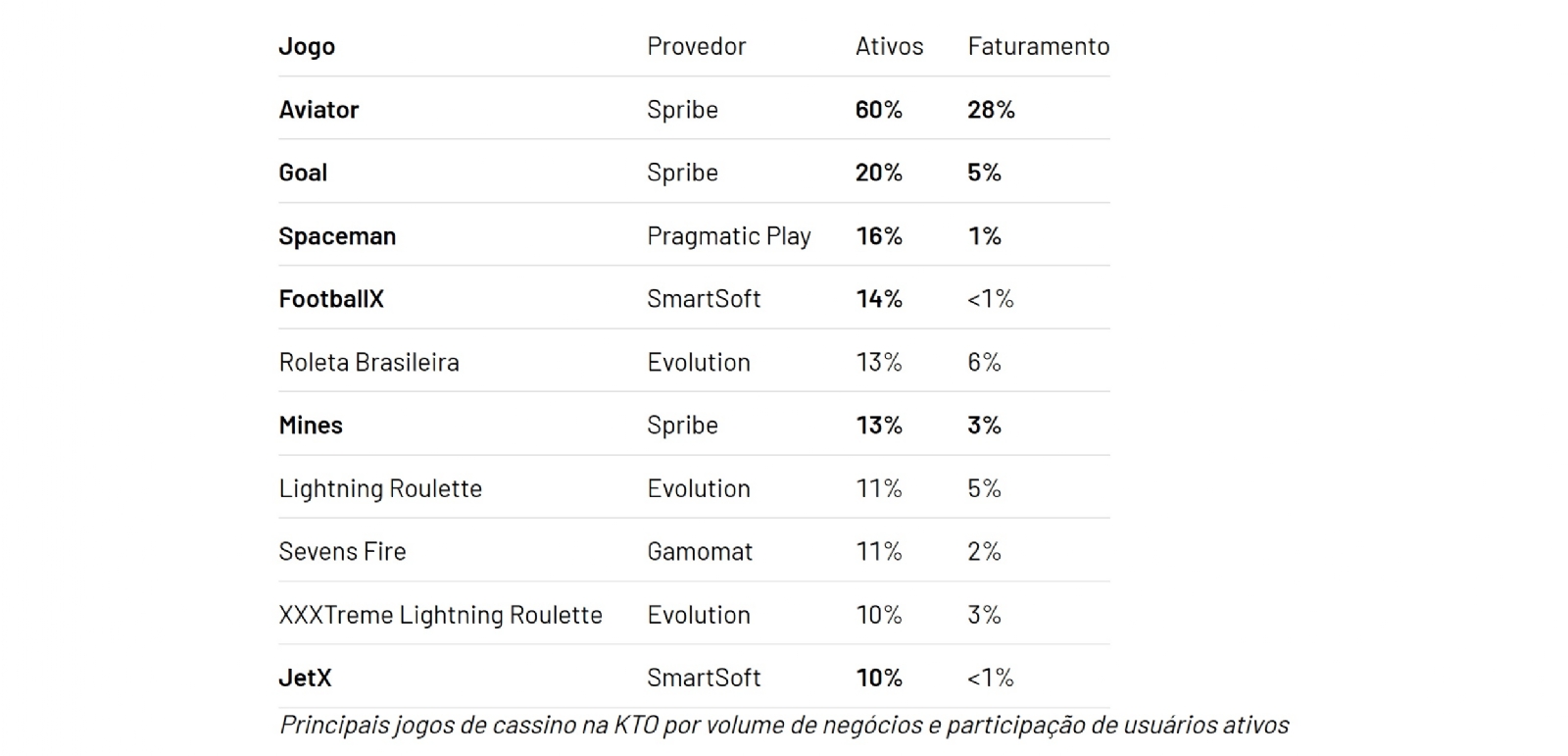 Mais importante ainda, os jogos estilo crash atraem cerca de dois terços dos jogadores ativos no cassino online da KTO e combinam quase 40% do faturamento total dos jogos de cassino.