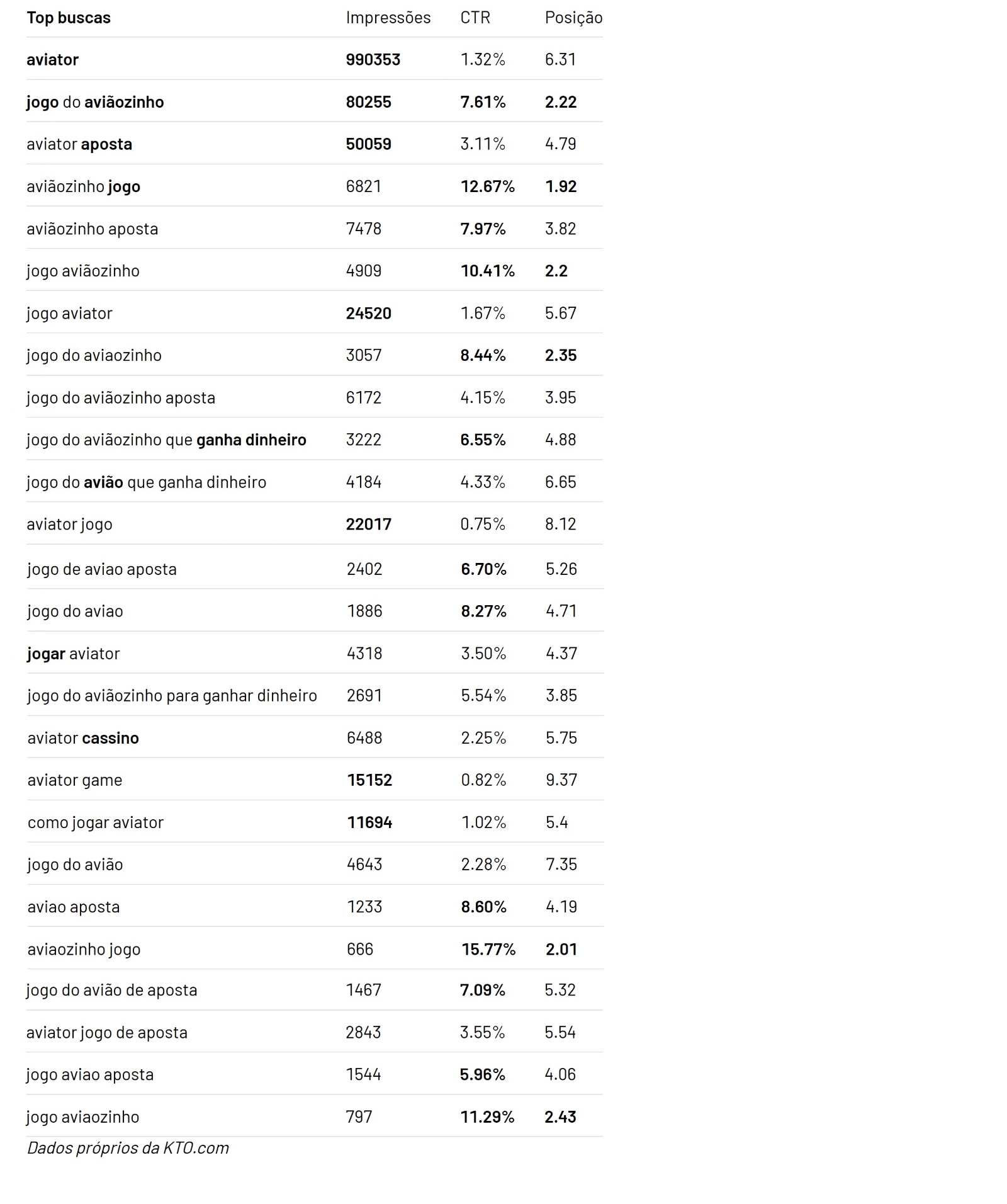 Ao todo, em apenas alguns meses, registramos 1,434 milhão de impressões listando a página Aviator da KTO com uma posição média na página de resultados do mecanismo de pesquisa (SERP) de 6,11 e uma CTR média de 2,11%.Na verdade, o verdadeiro indicador do impacto do Aviator é o forte aumento da demanda ao longo do tempo: