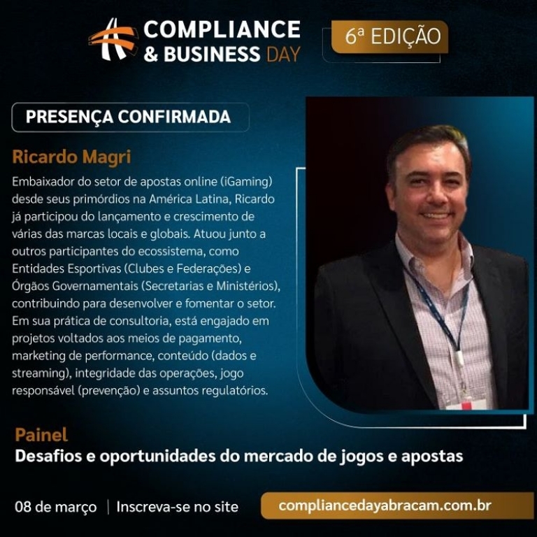 Os especialistas convidados vão contribuir da melhor forma possível para informar, esclarecer e, principalmente, desmistificar as questões de compliance da movimentação financeira do setor. Eles fecharão o encontro no Painel 4: "Desafios e Oportunidades do Mercado de Jogos e Apostas":