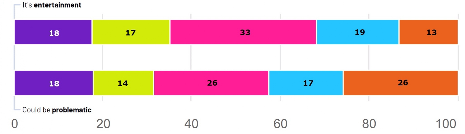 Mais importante ainda, aqueles que estão cientes de que o jogo pode ser potencialmente problemático – seja pessoal e/ou socialmente – são ainda mais de dois terços (68% para os níveis 3-5). Apenas 32% não conseguem prever quaisquer problemas potenciais decorrentes de outros jogadores.