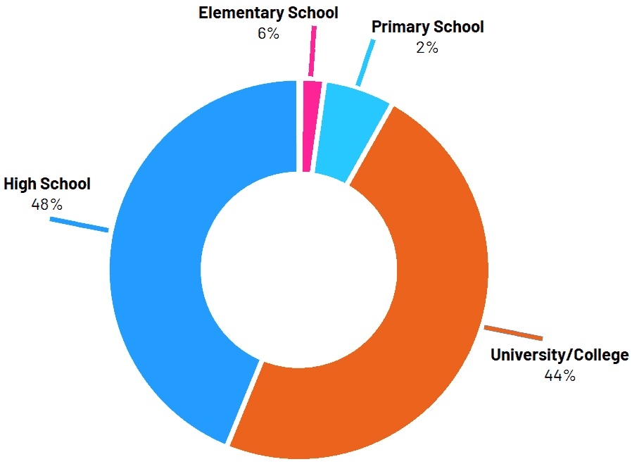 A maior parcela dos jogadores indicou pelo menos o ensino médio completo – 48%. Os graduados em universidades e faculdades vêm em segundo lugar (44%). Apenas parcelas menores do pool total de jogadores lutaram na escola e mal concluíram os níveis escolares primários (2%) ou elementares (6%). Não houve respondentes analfabetos.