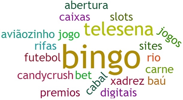 Quando questionados sobre “outros” jogos em dinheiro real, os entrevistados indicaram uma ampla seleção de gêneros e palavras-chave (veja a nuvem de palavras abaixo). As variantes de loteria voltaram a ser as mais comuns, seguidas das slots e crash games (ex. aviãozinho), enquanto alguns ainda citaram “abrir loot boxes” e jogos casuais não pagos como “candy crush”.