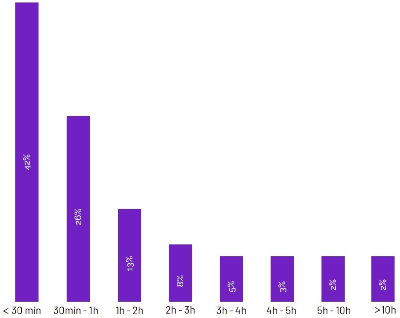A maioria das pessoas gasta menos de 30 minutos por semana (42%) ou no máximo menos de uma hora (58%). As participações dos jogadores diminuem rapidamente quando a duração semanal aumenta, com pouco mais de 2% gastando mais de uma hora por dia.