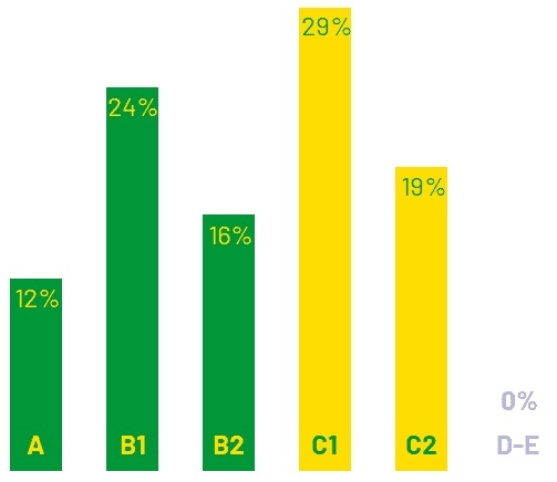 Os escalões socioeconómicos começam em A (famílias mais abastadas), descem até B1, B2 (aproximadamente comparável à classe média alta e baixa), C1, C2 e terminam em D–E (famílias ou indivíduos com praticamente nenhum rendimento disponível).