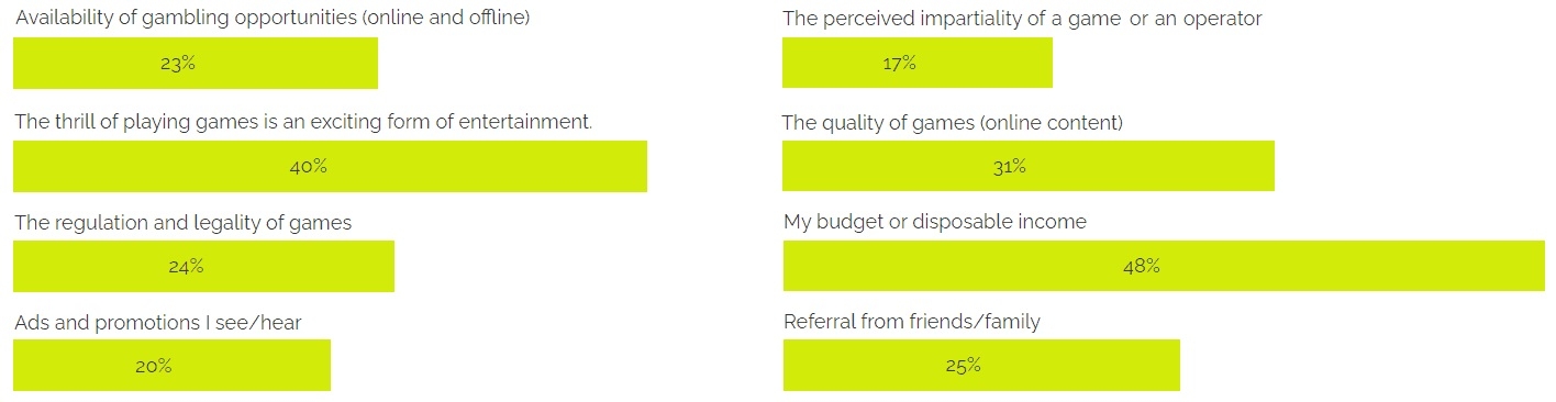 Naturalmente, a disponibilidade de renda disponível é o principal fator desencadeador (48%) para quem gosta de jogar jogos em dinheiro real. A emoção e excitação dos jogos é o segundo fator de influência mais comum (40%) – possivelmente seria o primeiro, se o orçamento não fosse um problema.