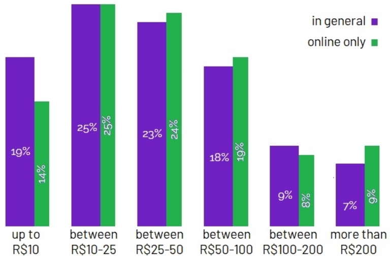 Se considerarmos os jogos online e offline, cerca de dois terços dos jogadores (67%) gastam menos ou até R$ 50 por mês. Isso é cerca de US$ 10 mensais, enfatizando a natureza de entretenimento dos jogos em dinheiro real para a maioria dos usuários. Um quinto (19%) chega a gastar menos de R$ 10, enquanto apenas 7% admitem gastar mais de R$ 200 por mês.