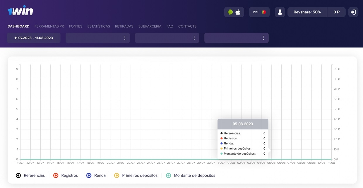 Dashboard. Na primeira página estão todos os resultados do trabalho. O parceiro poderá ver informações sobre todas as transições, registros, depósitos e, claro, a renda do período atual. As informações são atualizadas em tempo real. Está disponível a classificação por fontes de tráfego, GEO e links individuais.