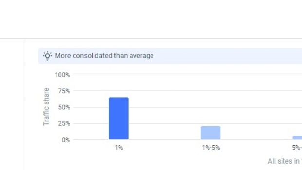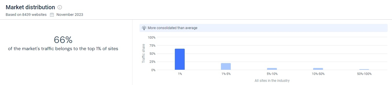 Do total de visitas registradas em novembro de 2023, 66% delas foram para apenas 1% dos sites da indústria. Isso indica uma concentração de tráfego em alguns domínios do setor.