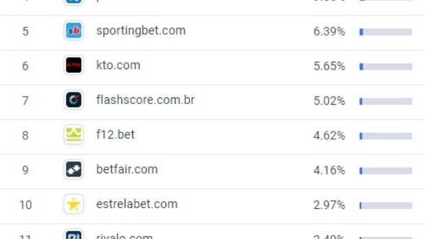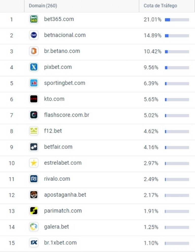 Dentro desse 1% mencionado, estão os sites de apostas com maior participação no tráfego: bet365 lidera com 21% do tráfego, seguido por Betnacional, com 14,9%, Betano, com 10,4%, Pixbet, com 9,6%, Sportingbet, com 6,4%, e KTO, com 5,6%.