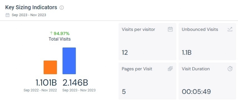 De setembro a novembro de 2023, os sites de apostas acumularam um total de 2,1 bilhões de visitas, com uma média de 6 minutos por acesso. Apenas em novembro, foram 61,4 milhões de visitantes únicos.